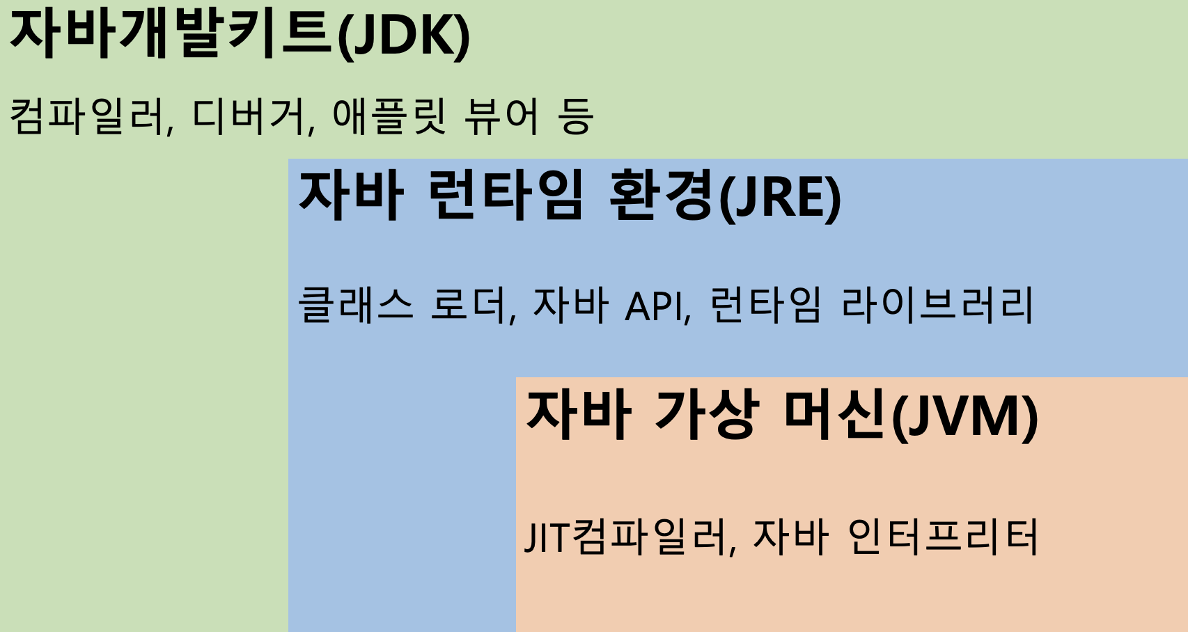 Java 플랫폼은 JDK(Java Development Kit), JRE(Java Runtime Environment), JVM(Java Virtual Machine)의 계층적으로 구성되며 Java 언어를 바이트코드, 기계어 등으로 변환하는 역할을 수행한다.